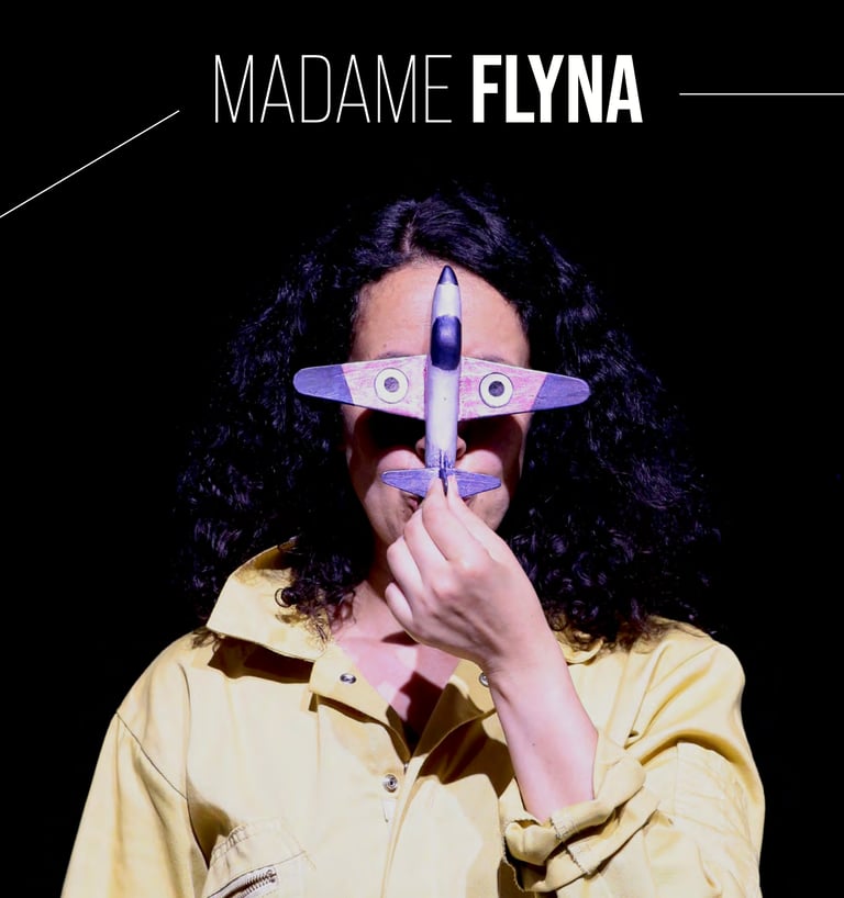 Poursuivie par de mystérieux trappeurs de rêve, Madame Flyna nous raconte, dans un récit qui mélange les langues avec malice, comment elle a réalisé son vœu le plus cher : piloter un avion. Inspiré de la figure de Touria Chaoui, première aviatrice marocaine, ce spectacle qui joue avec les mots et les objets est une invitation à toujours croire en ses rêves.